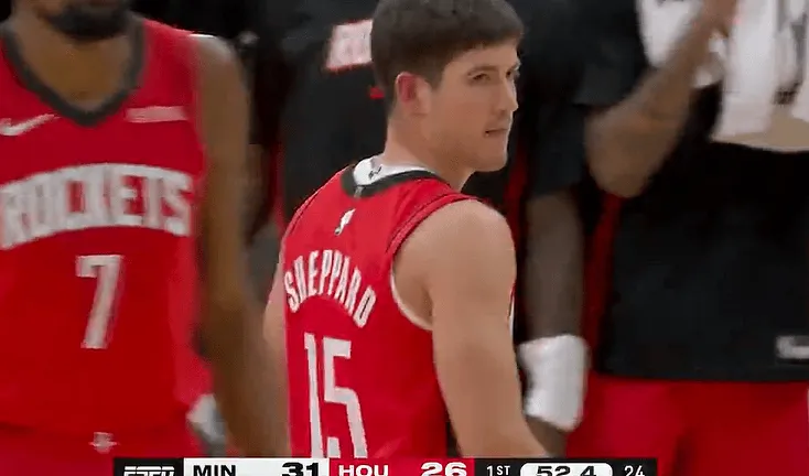 第一节比赛,谢泼德外线连中三记三分,火箭首节落后森林狼5分。